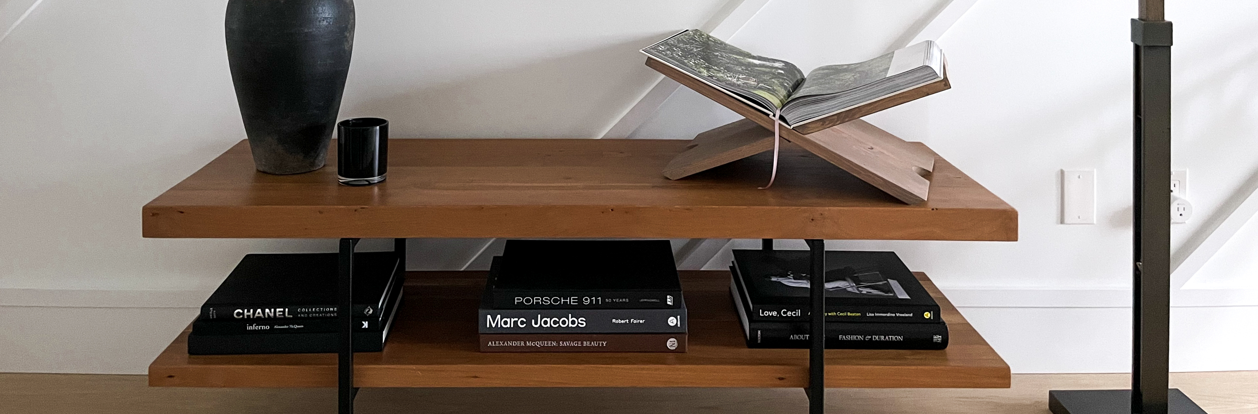 The second book display has entered the building! After my first smaller book display (following the directions of the Joinery and Co), I knew I wanted something more grand to fit those larger-scale coffee table books. Luckily with my trusty tools, I turned that into reality using the same principles as before. The only difference being I put my math skills to the test. What I learned is that I used to be far better at math than I am now, but after a few trials and errors, I made things happen. Specifically, I made this epically large book display happen which I drool over every time I see it. It’s now displayed under our coffee table (which admittedly doesn’t photograph the best). The top of our coffee table is glass, so I’ve picked a beautiful picture of Liz Taylor’s garden to be displayed (pictured below). Then I sit in my new favourite chair that is perfectly situated to admire this gigantic book display.