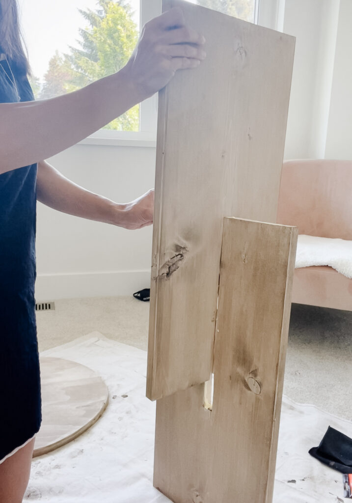 - Glue your legs together and then slide those puzzle pieces in! I also opted to fill along the sides to fully hide the seam – the choice is yours. You will need to do one more round of paint/glaze if you go this route. Make sure the base is level!