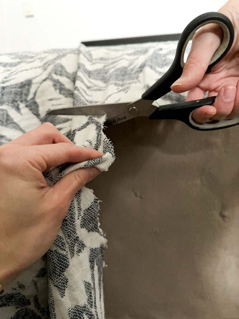 - Depending on how much excess fabric you have along the long edge of your ottoman, cut it off. You want to leave a little overhang just in case. I did this step each time I started a side to ensure I wasn’t cutting away too much fabric.