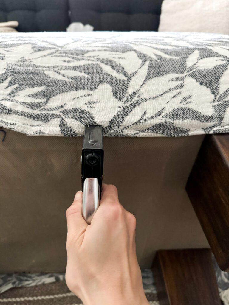 I debated between a nail gun and a staple gun. I had the baby with me for the first bit of this reupholstery effort, so I tried the staple gun since it was a quieter option. I was pleasantly surprised when it worked. In addition to a staple gun to reupholster your ottoman without a sewing machine, you also need fabric, scissors, and potentially a glue gun. The glue gun is up to you and slightly dependent on how your ottoman turns out.