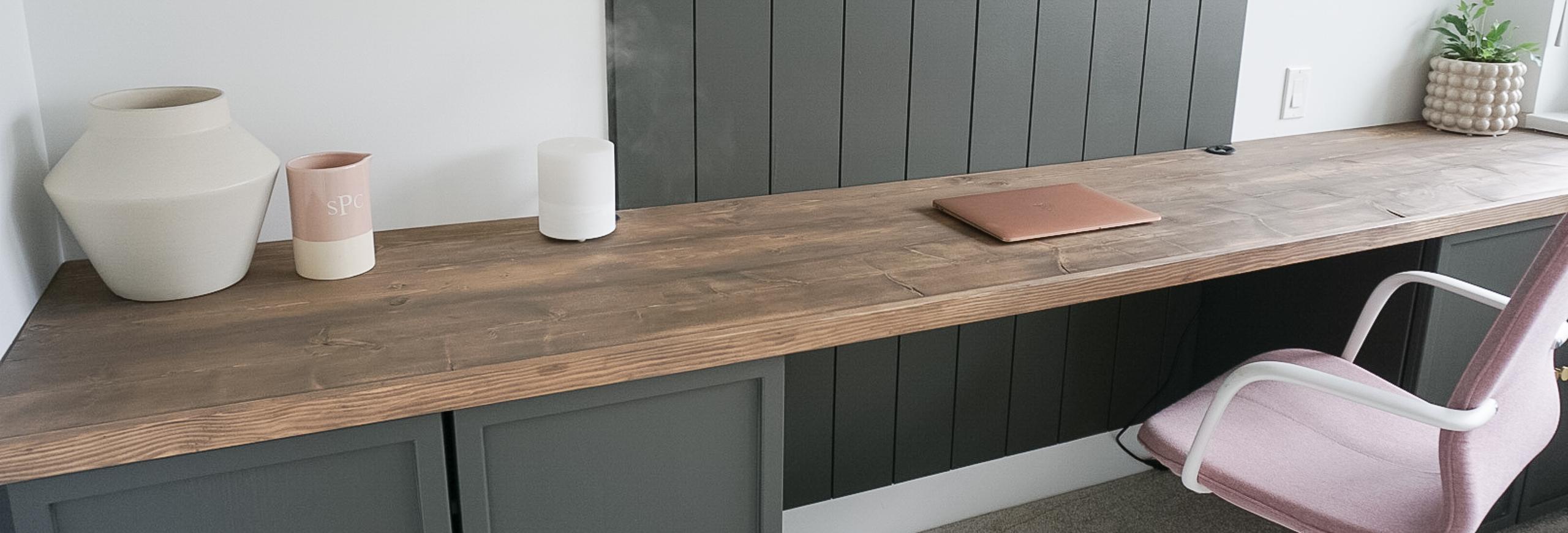 Really loving your week by week explanation of this project. I’m trying to build something similar for our basement, except the wall I want to use is 187″ long lol. Do you have any tutorial or can briefly explain how you made the tabletop?