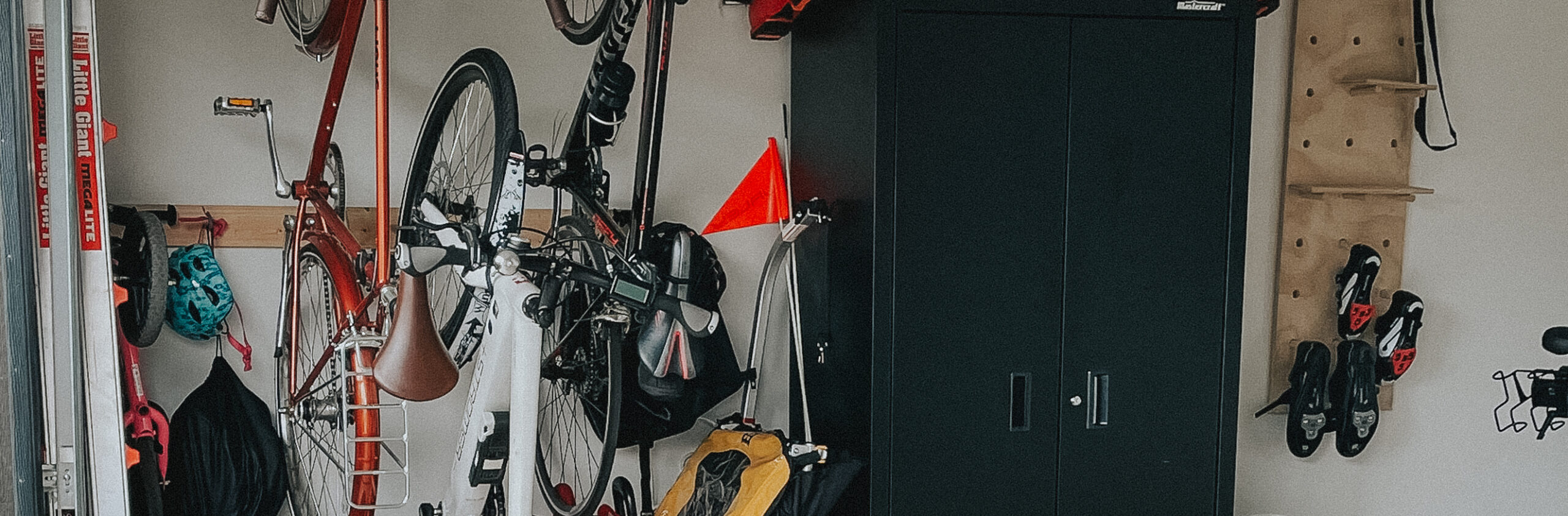 Look at this sparkly clean and organized (almost) 1/3 of the garage! LOOK AT IT! It’s so beautiful. Now, I fully respect and understand that not everyone will have the ability to build a massive storage shed where half their junk can go live sight unseen; HOWEVER, I still purged an extraordinary amount from here. There was a lot that was completely unused and was likely not going to be used for the foreseeable future (i.e., my cruiser bike – we have an e-bike after all!!!). I kept it to the bare minimum of what we needed here (somehow, the bare minimum includes three bicycles but whatever). I also tried to go up as much as possible. Organizing all of the bikes hanging from the ceiling was a must have. The e-bike was too heavy to hang from the ceiling, but I made sure to continue to utilize vertical space.