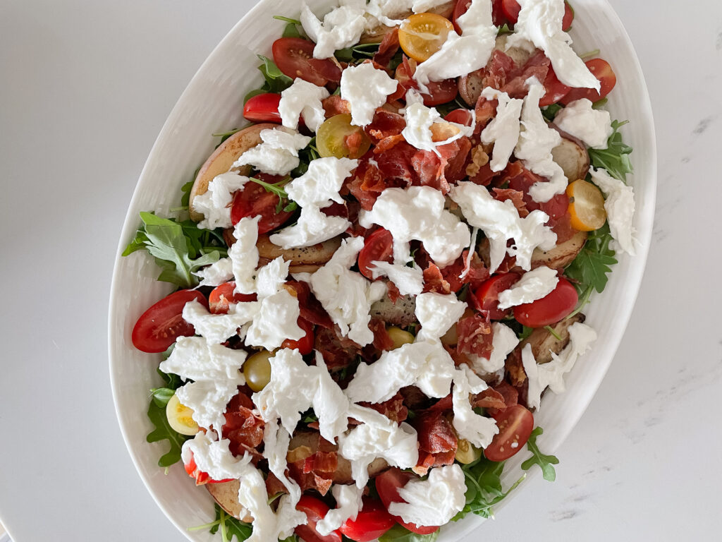 - Right before you are ready to serve your prosciutto, peach and burrata salad, drizzle your dressing on top.