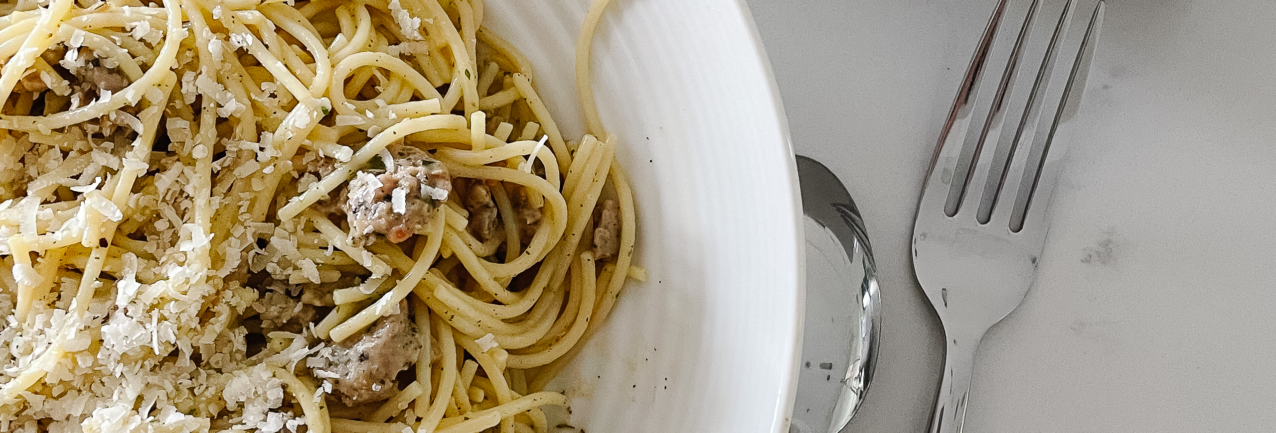 McGregor stopped eating pork, well over a year ago now, maybe even closing in on two.. anyways, I used to love love love making carbonara. Until I couldn’t use my favourite pancetta anymore. I tried many variations to reach a flavour-filled dish, but it wasn’t until I tried it with this sausage carbonara out did I get that flavour I was missing.