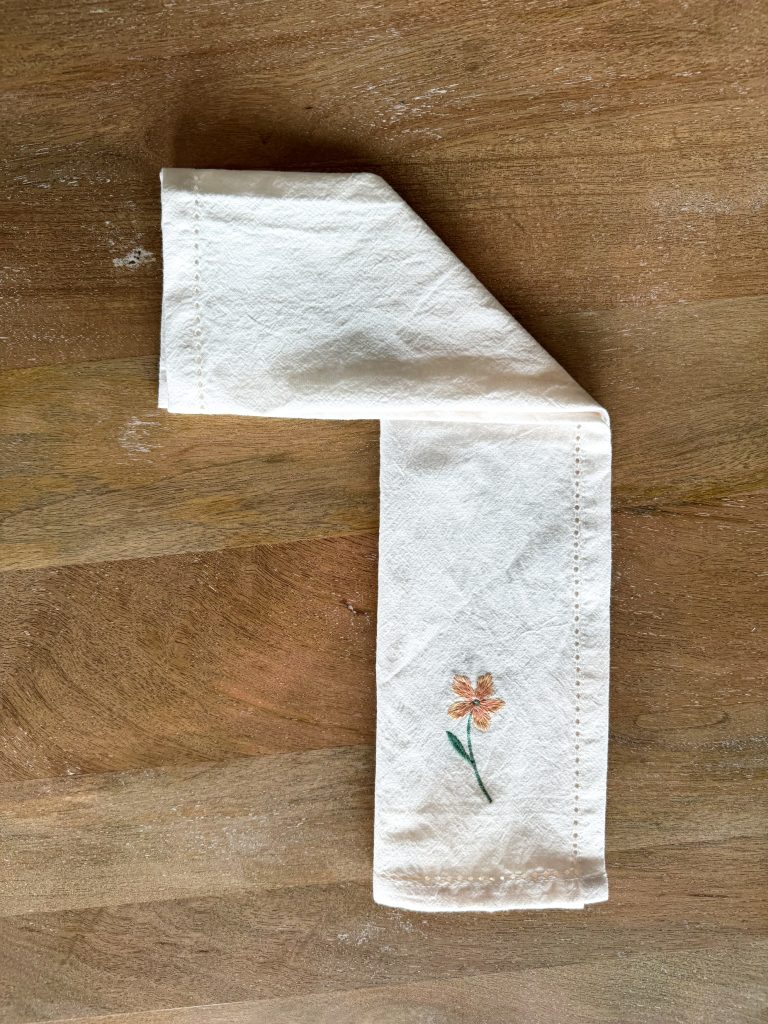 On the difficulty scale, we are moving one baby step up in the next Easter napkin fold. This one is less haphazard – and requires a little bit of preplanning. See, the sweet bunny ears here have space for an egg. So if you’re hosting brunch, a hardboiled egg could live here perfectly. If that’s not. your style, you could do a decorated Easter egg that one of the children did. If you’re not into either, stick with Easter napkin fold one or three and skip this. This one starts the same as the Lazy Girl Bunny Ears. If your napkin is square, this will work. First, fold your napkin into a triangle – the two kitty-corner corners come together. Roll the napkin up from the tip of the triangle. Curve the roll up and tie it so an egg fits in between.